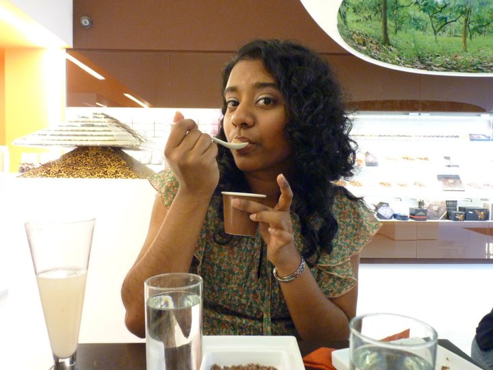 Chocolate is something you can play with and these artists of chocolate love to add different things to theirs. I tasted chocolate with lemongrass and ginger, tobacco, mexican chilli and other spices, sage and thyme, guiness, black pepper, lavender, raspberry and dark chocolate truffles. Artisan du Chocolat's signature chocolate is the Salted Caramels. The launching pad for this was one of Gordon Ramsey's restaurants and it was such a big hit. Adding unrefined sea salt to caramel and pairing it with chocolate is an absolute delight. They've also included a banana puree to this, pink and black peppercorns and an assorted variety of flavours to their salted caramel. Did I mention they even have salted caramel ice cream. Super yum! It was served with a chocolate fondant cake... which was super scrumptious. To wash it all down was water and there was an alcoholic drink, a bellini which is sparkling wine usually mixed with peach puree but was instead mixed with the pulp of the cocoa.